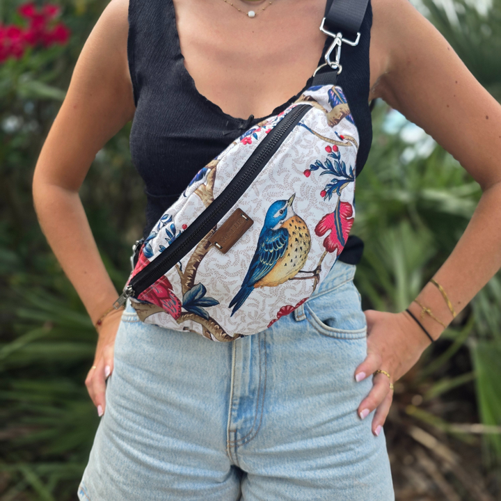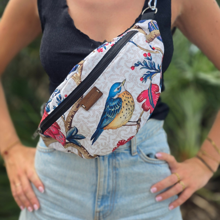 Sac banane en tissu Thévenon dessin d'oiseaux bleus